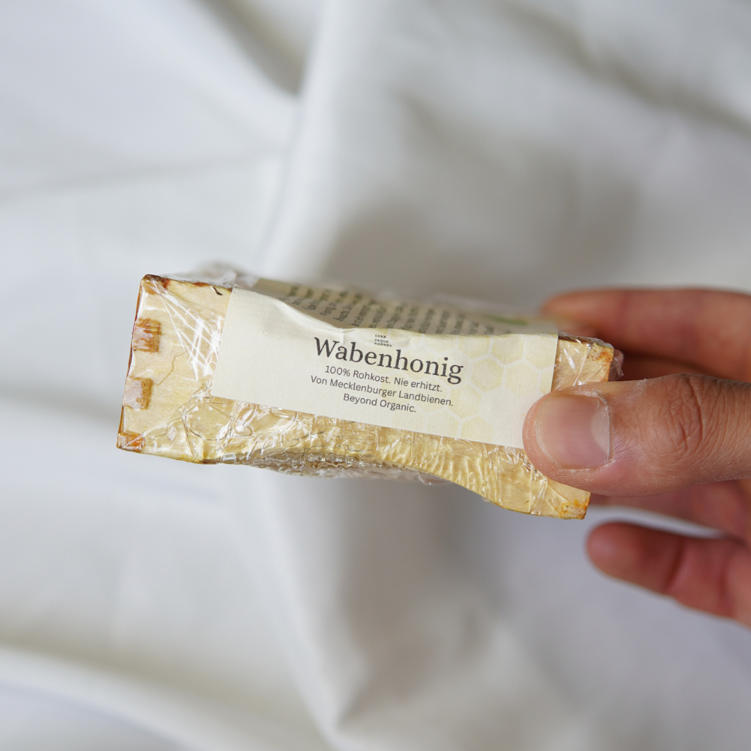 Wabenhonig. Ein Geschenk unserer heimischen Natur. In deiner Honigwabe findest du nicht nur reinen Honig, sondern auch essbares Bienenwachs. Das Herstellen der Wabe ist ein enorm aufwendiger Prozess, weshalb wir für 2025 nur eine kleine Menge von ca. 200 Stück stehen zur Verfügung. Richtig lecker schmeckt ein Stück Honigwabe auf einem warmen Sauerteigbrot mit unserem Tahini, etwas Ceylon-Zimt und einem Preis Ur-Salz.